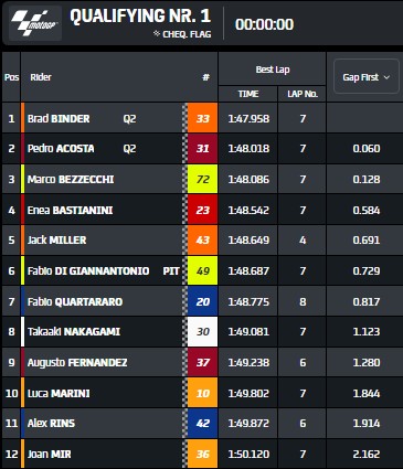 Πράγματι, η πλειονότητα των αναβατών βρήκε περισσότερη απόδοση και οι χρόνοι κατέβηκαν σημαντικά. Στο τέλος της διαδικασίας ο Μπίντερ ήταν ο ταχύτερος αναβάτης με το 1:47,958. Μαζί του στο Q2 προκρίθηκε ο Ακόστα, ενώ ο Μίλερ αποδείχθηκε ο… σκουντούφλης του Q1. O Αυστραλός δεν βγήκε εγκαίρως στην πίστα και δεν πρόλαβε να κάνει γρήγορη προσπάθεια.