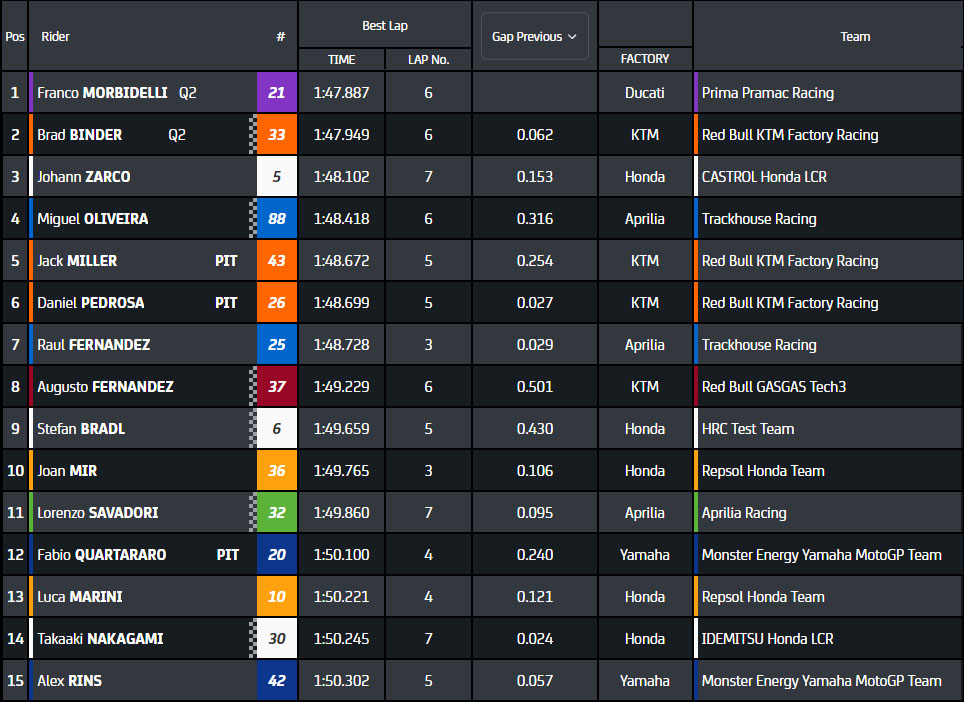 Δεύτερος ήταν ο Μάρκο Μπεζέκι της VR46, ο οποίος θέλει να πάρει ένα καλό αποτέλεσμα στο τριήμερο, ενώ τρίτος ήταν ο πρωτοπόρος της βαθμολογίας, Χόρχε Μαρτίν της Pramac Racing. Από την 7η θέση μόλις θα εκκινήσει ο παγκόσμιος πρωταθλητής, Πέκο Μπανάια, ενώ ο εκπληκτικός rookie, Πέδρο Ακόστα, κατετάγη 10ος.