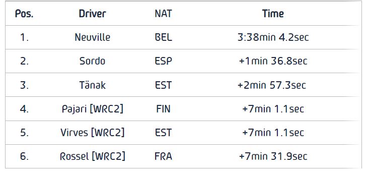 Στην κατηγορία WRC2 συνέβη το απίστευτο: Ο Παγιάρι (Toyota) και ο Βίρβες (Skoda) ολοκλήρωσαν τον αγώνα με ακριβώς τον ίδιο χρόνο: 3 ώρες, 45 λεπτά, 5 δευτερόλεπτα και 3 δέκατα! Η νίκη όμως πηγαίνει στον Παγιάρι γιατί είχε κερδίσει την πρώτη ειδική διαδρομή!
