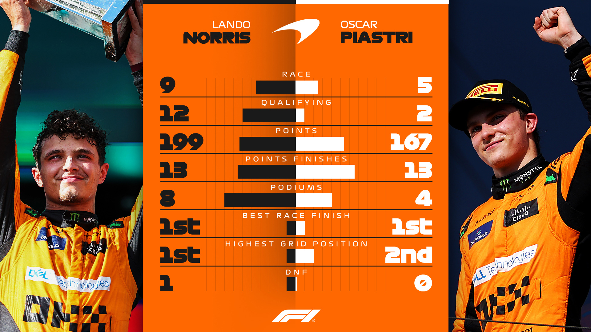 Στη βαθμολογία ο Norris έχει 199 βαθμούς και βρίσκεται στη 2η θέση ενώ ο Piastri έχει 167 βαθμούς και είναι 4ος στη βαθμολογία. Παρά την υπεροχή του Βρετανού στους αγώνες, η μεταξύ τους διαφορά είναι πολύ μικρή, όπως και ταχύτητά τους. Στη μάχη των βάθρων, ο Norris μετράει 8 σε 14 αγώνες και ο Piastri μόλις 4, εκ των οποίων τα τρία τα έχει πετύχει στα τρία τελευταία Grand Prix.
